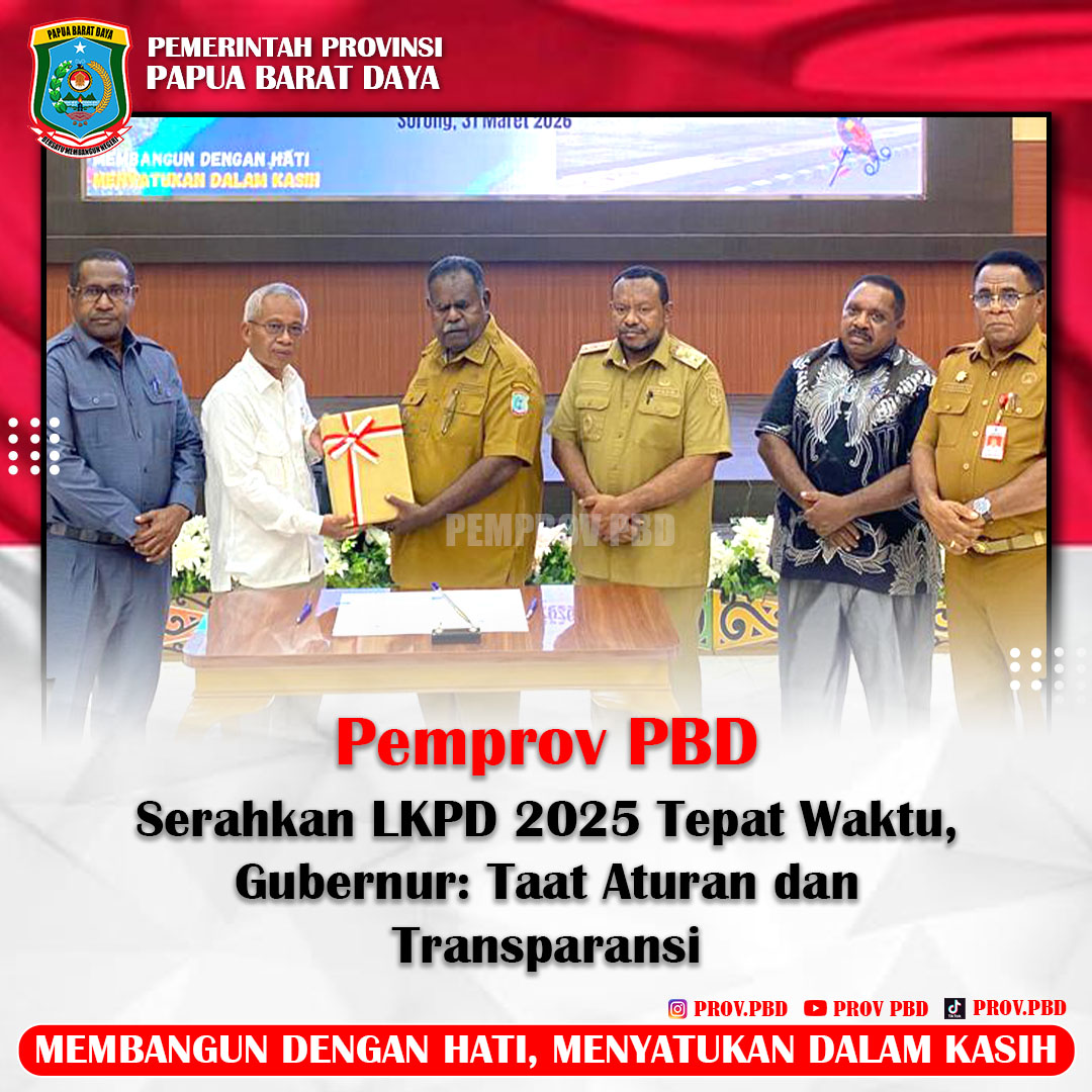 SORONG-Gubernur Papua Barat Daya Elisa Kambu, S.Sos, secara resmi menyerahkan Laporan Keuangan Pemerintah Daerah (LKPD) Tahun Anggaran 2025 kepada Badan Pemeriksa Keuangan (BPK) Perwakilan Papua Barat Daya, pada Selasa (31/03/2026).