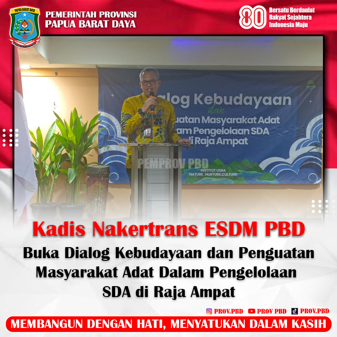 SORONG-Gubernur Papua Barat Daya, Elisa Kambu, S.Sos., yang diwakili Kepala Dinas Tenaga Kerja, Transmigrasi, Energi dan Sumber Daya Mineral (Nakertrans ESDM), Suroso, S.IP., MA, membuka secara resmi Dialog Kebudayaan dan Penguatan Masyarakat Adat dalam Pengelolaan Sumber Daya Alam (SDA) di Raja Ampat, yang berlangsung di Mariat Hotel, Kota Sorong, Kamis (02/10/2025).