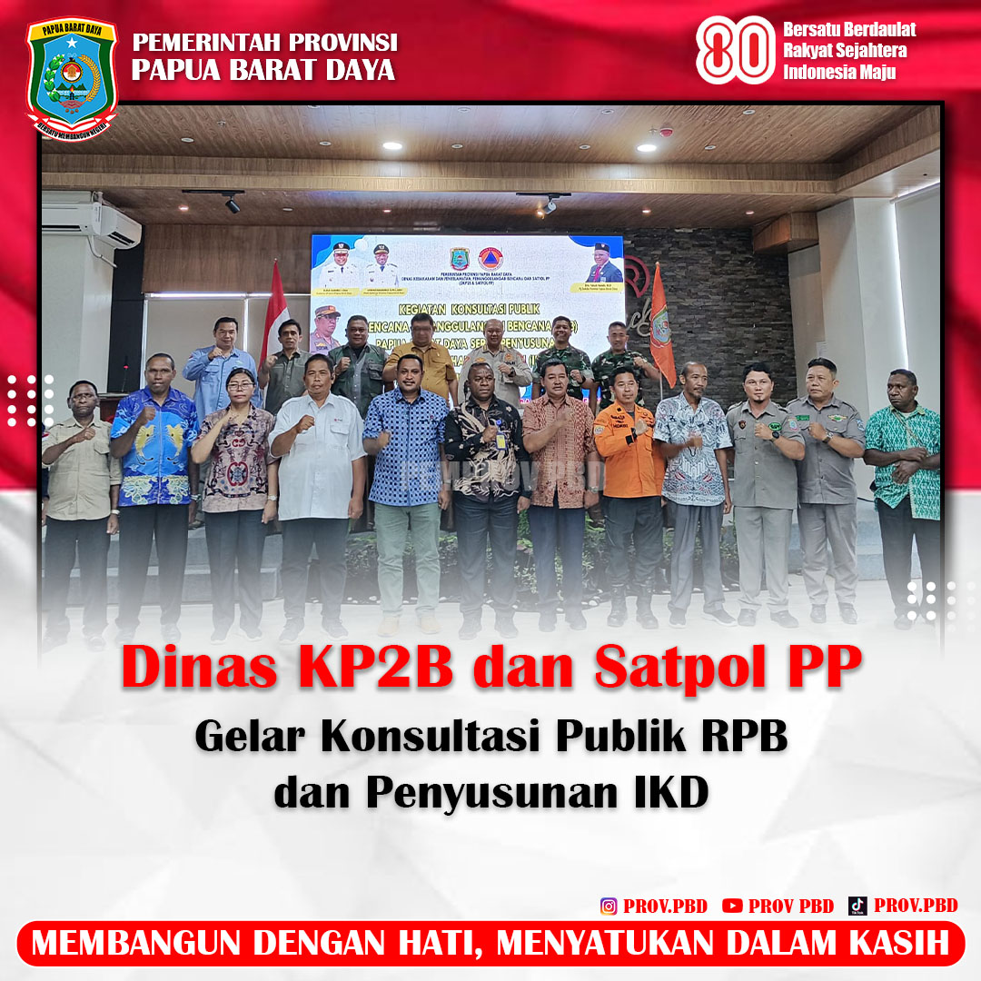 SORONG-Pemerintah Provinsi Papua Barat Daya melalui Dinas Kebakaran, Penyelamatan, Penanggulangan Bencana, dan Satuan Polisi Pamong Praja (DKP2B dan Satpol PP) menggelar Konsultasi Publik Rencana Penanggulangan Bencana (RPB) dan Penyusunan Indeks Ketahanan Daerah (IKD) se-kabupaten/kota di wilayah Papua Barat Daya, bertempat di Rylich Panorama Hotel, Sorong, Kamis (23/10/2025).