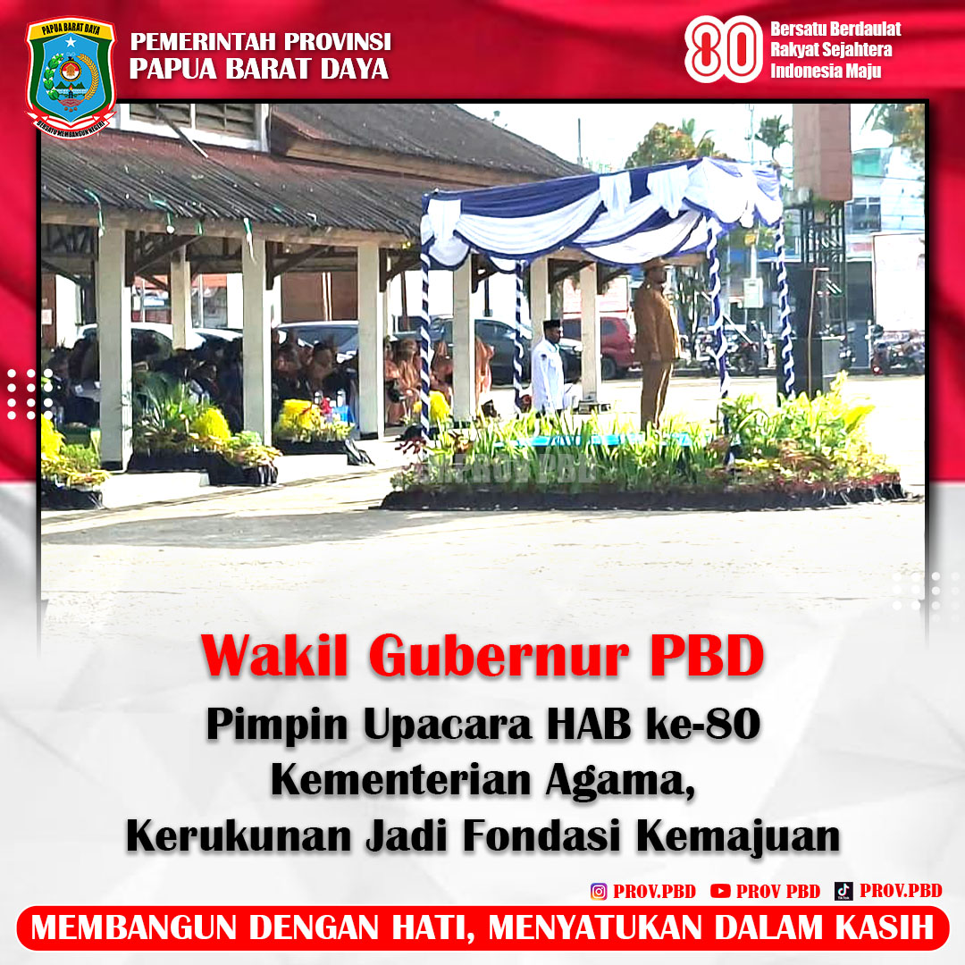 AIMAS-Wakil Gubernur Papua Barat Daya, Ahmad Nausrau, S.Pd.I., MM., memimpin upacara bendera peringatan Hari Amal Bakti (HAB) ke-80 Kementerian Agama RI Tingkat Provinsi Papua Barat Daya, yang berlangsung di Alun-alun Aimas, Kabupaten Sorong, Senin (05/01/2026).